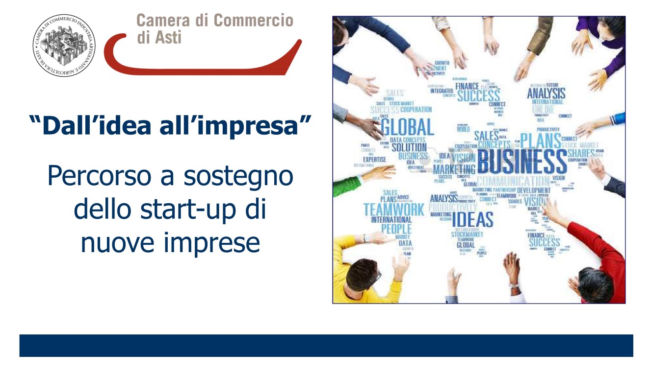 La Camera di Commercio di Asti nell’ambito del progetto “Sviluppo dei servizi di sostegno alla creazione e allo start up di imprese”, finanziato dal Fondo di Perequazione, organizza il percorso formativo "Dall'idea all'impresa" rivolto ad aspiranti imprenditori, in particolare giovani, donne e immigrati, che hanno un’idea imprenditoriale e che sono pronti ad impegnarsi per tradurla in realtà.