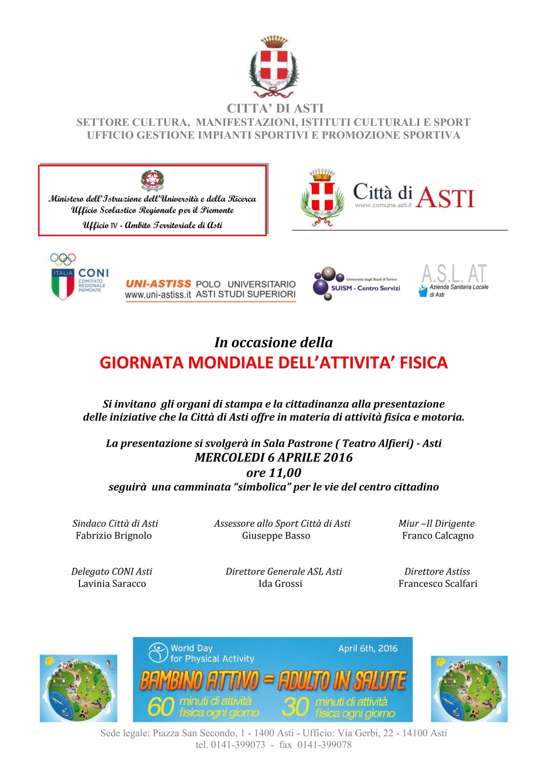 In occasione della GIORNATA MONDIALE DELL’ATTIVITA’ FISICA si invitano gli organi di stampa e la cittadinanza alla presentazione delle iniziative che la Città di Asti offre in materia di attività fisica e motoria.