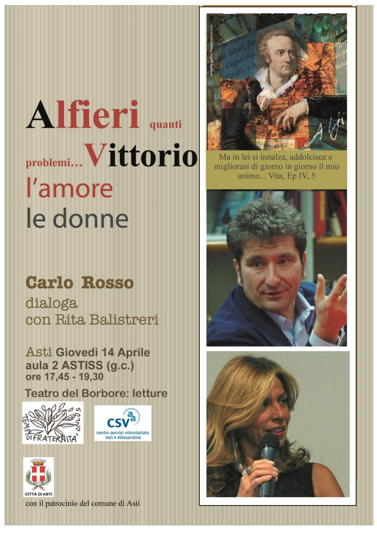 Giovedì 14 aprile (ore 17,45-19,30) Carlo Rosso, psichiatra sessuologo, dialogerà con Rita Balistreri, giornalista. sul tema “Alfieri e le donne”, in un'aula messa cortesemente a disposizione dall'ASTISS (Polo universitario, ex Caserma Colli di Felizzano). Sarà il quarto incontro alfieriano del 2016 organizzato dall'Associazione culturale di volontariato “Tempi di fraternità” (onlus).