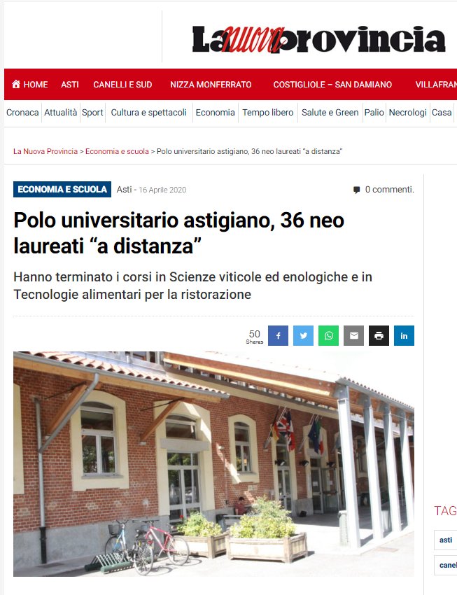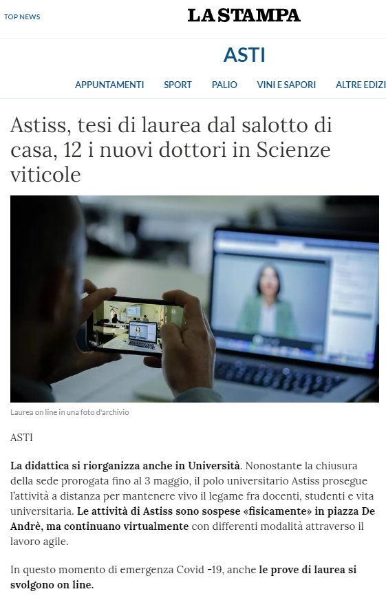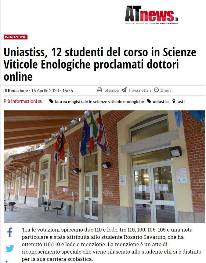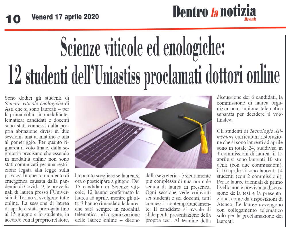 Dodici studenti di Scienze Viticole ed Enologiche, il 16 aprile si sono laureati in modalità telematica: candidati e docenti sono stati connessi dalla propria abitazione divisi in due sessioni, una al mattino e una al pomeriggio. Per quanto riguarda il voto finale, dalla segreteria precisano che essendo in modalità on line non sono stati comunicati per una restrizione legata alla legge sulla privacy.
