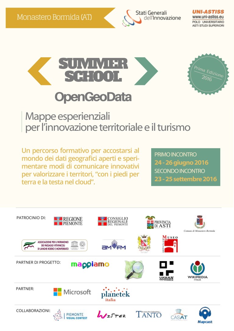 Questo indirizzo email è protetto dagli spambots. È necessario abilitare JavaScript per vederlo.Partecipate al gruppo FB “Tra Langhe, Roero, e Monferrato Open Data”Scaricate e diffondete il flyer della Summer School OpenGeoData 2016