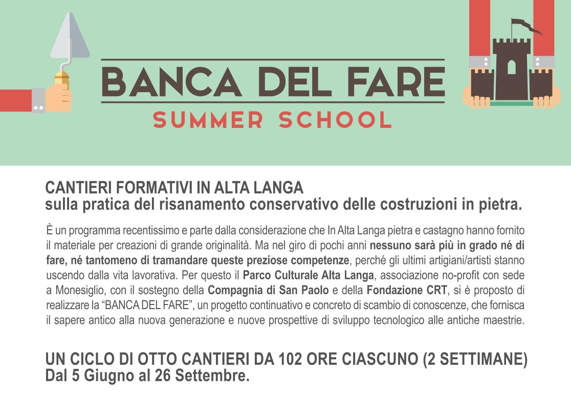 È un programma recentissimo e parte dalla considerazione che In Alta Langa pietra e castagno hanno fornito il materiale per creazioni di grande originalità. Ma nel giro di pochi anni nessuno sarà più in grado né di fare, né tantomeno di tramandare queste preziose competenze, perché gli ultimi artigiani/artisti stanno uscendo dalla vita lavorativa. Per questo il Parco Culturale Alta Langa, associazione no-profit con sede a Monesiglio, con il sostegno della Compagnia di San Paolo e della Fondazione CRT, si è proposto di realizzare la “BANCA DEL FARE”, un progetto continuativo e concreto di scambio di conoscenze, che fornisca il sapere antico alla nuova generazione e nuove prospettive di sviluppo tecnologico alle antiche maestrie.