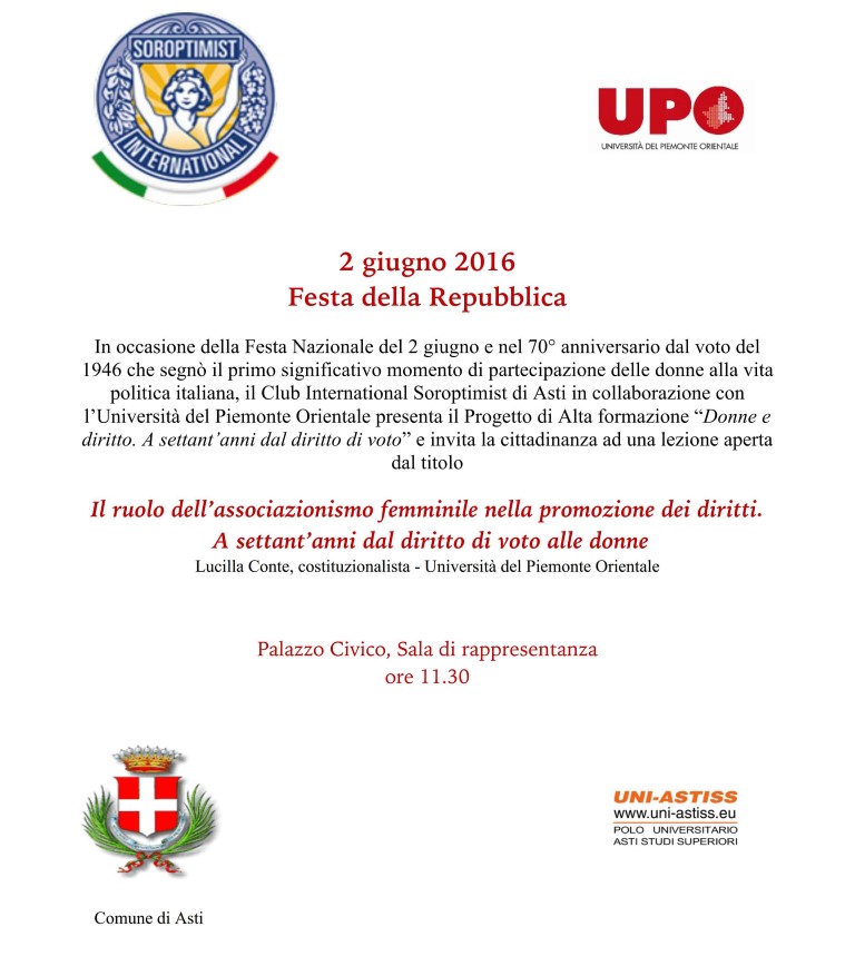 In occasione della Festa Nazionale del 2 giugno e nel 70° anniversario dal voto del 1946 che segnò il primo significativo momento di partecipazione delle donne alla vita politica italiana, il Club International Soroptimist di Asti in collaborazione con