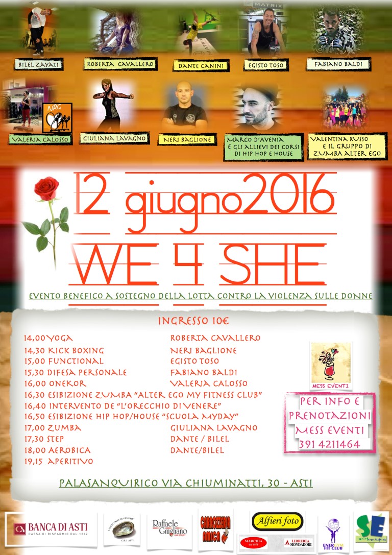 Domenica 12 giugno al Palasanquirico a partire dalle ore 14, un ricco di programma di lezioni animeranno la prima Convention di Fitness Musicale organizzata ad Asti e finalizzata alla raccolta fondi per la lotta contro la violenza sulle donne. Alcuni tra i migliori istruttori del Piemonte di varie discipline proporranno lezioni di Yoga, Autodifesa, Kick Boxing, Functional Training, NRG Training OneKor, Zumba, Step ed Aerobica. Nel corso della manifestazione si esibiranno i ragazzi del corso di Hip Hop e House di Marco D’Avenia (My Day Academy) ed il gruppo di Zumba di Valentina Russo (Alter Ego). L’ingresso a 10€ include la partecipazione a tutte le lezioni e l’aperitivo finale. Tutti i proventi dell’iniziativa verranno devoluti all’Associazione “L’Orecchio di Venere” che opera sul territorio offrendo sostegno e supporto alle vittime di violenza subita o assistita.
