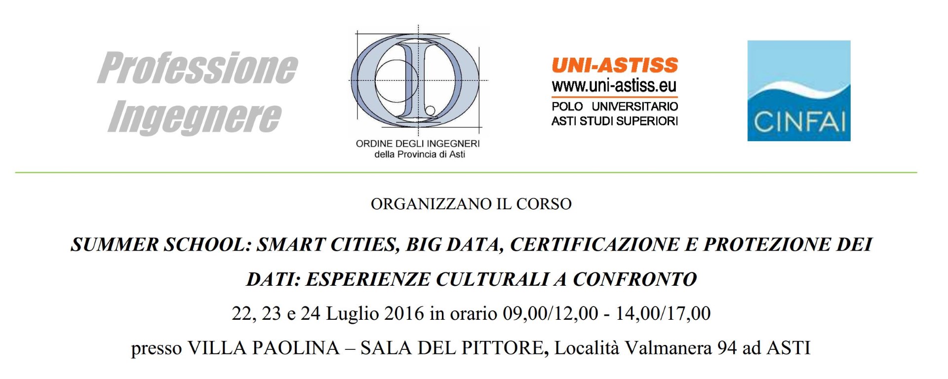 L'Ordine degli Ingegneri della Provincia di Asti organizza il corso SMART CITIES, BIG DATA, CERTIFICAZIONE E PROTEZIONE DEI DATI. ESPERIENZE CULTURALI A CONFRONTO che si svolgerà il 22, 23 e 24 Luglio 2016 a VILLA PAOLINA - SALA DEL PITTORE, Loc. Valmanera 94 ad Asti.