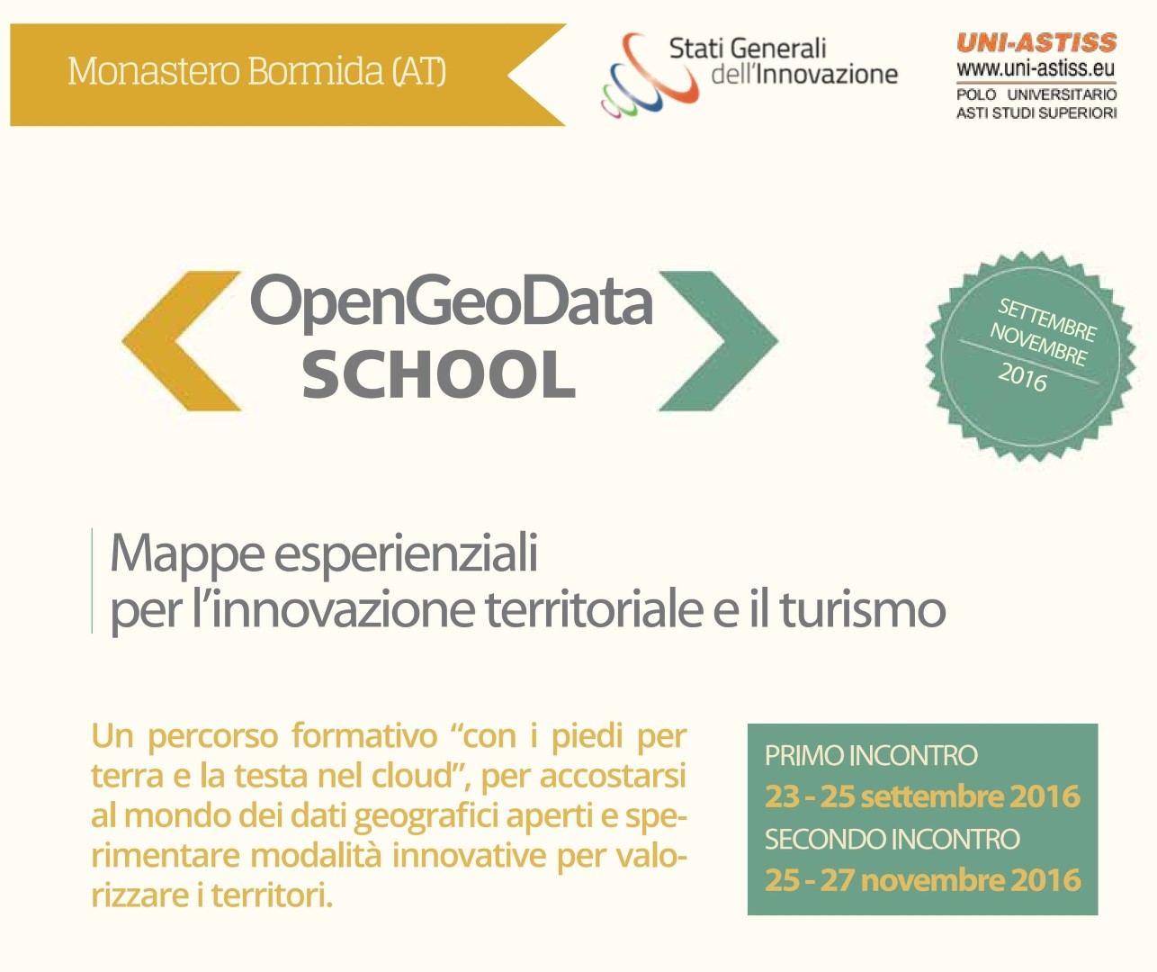 dell’OpenGeoData School è quello di creare le basi per lo sviluppo di iniziative di “turismo esperienziale” nel territorio Langhe, Roero e Monferrato, in grado di porre in risalto la capacità di accoglienza del territorio, valorizzando le auto-narrazioni delle comunità, a partire dalle culture materiali – con particolare attenzione alle filiere eno-gastronomiche – creando percorsi tematici geo-referenziati attraverso mappe esperienziali da utilizzare via mobile (app e web app).