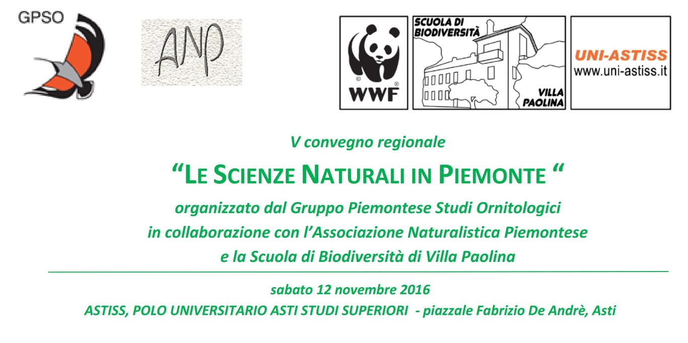 Il Gruppo Piemontese Studi Ornitologici, in collaborazione con l’Associazione Naturalistica Piemontese e la Scuola di Biodiversità di Villa Paolina organizzano il V convegno regionale “LE SCIENZE NATURALI IN PIEMONTE” sabato 12 novembre 2016 – presso ASTISS, POLO UNIVERSITARIO ASTI STUDI SUPERIORI – piazzale Fabrizio De Andrè, Asti.