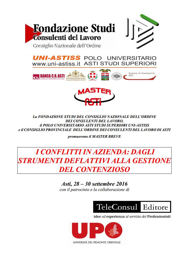 Nella 7ª edizione del nostro Master Breve parleremopertanto degli strumenti, dal welfare aziendale alla creazione del lavoro di squadra e di rapporti professionali soddisfacenti, che dovrebbero aiutare a creare in azienda un clima sereno che favorisce la prevenzione dei conflitti; ci occuperemo però anche della fase patologica delle controversie, sia con i lavoratori che con gli enti, sempre con l’obiettivo di portarci a casa una conoscenza concreta per aiutare le aziende a ridurre i rischi di contenzioso e a gestirlo adeguatamente