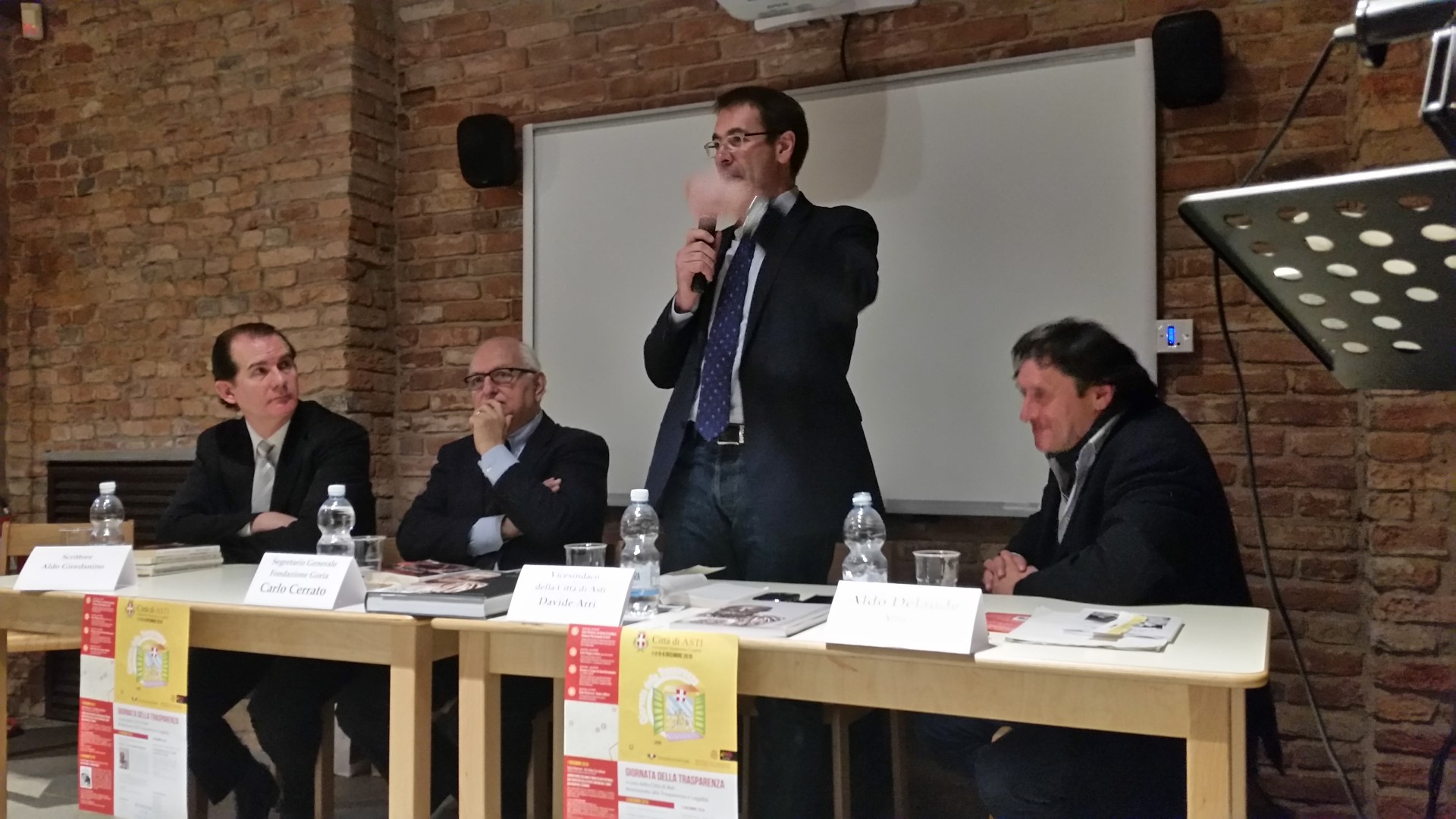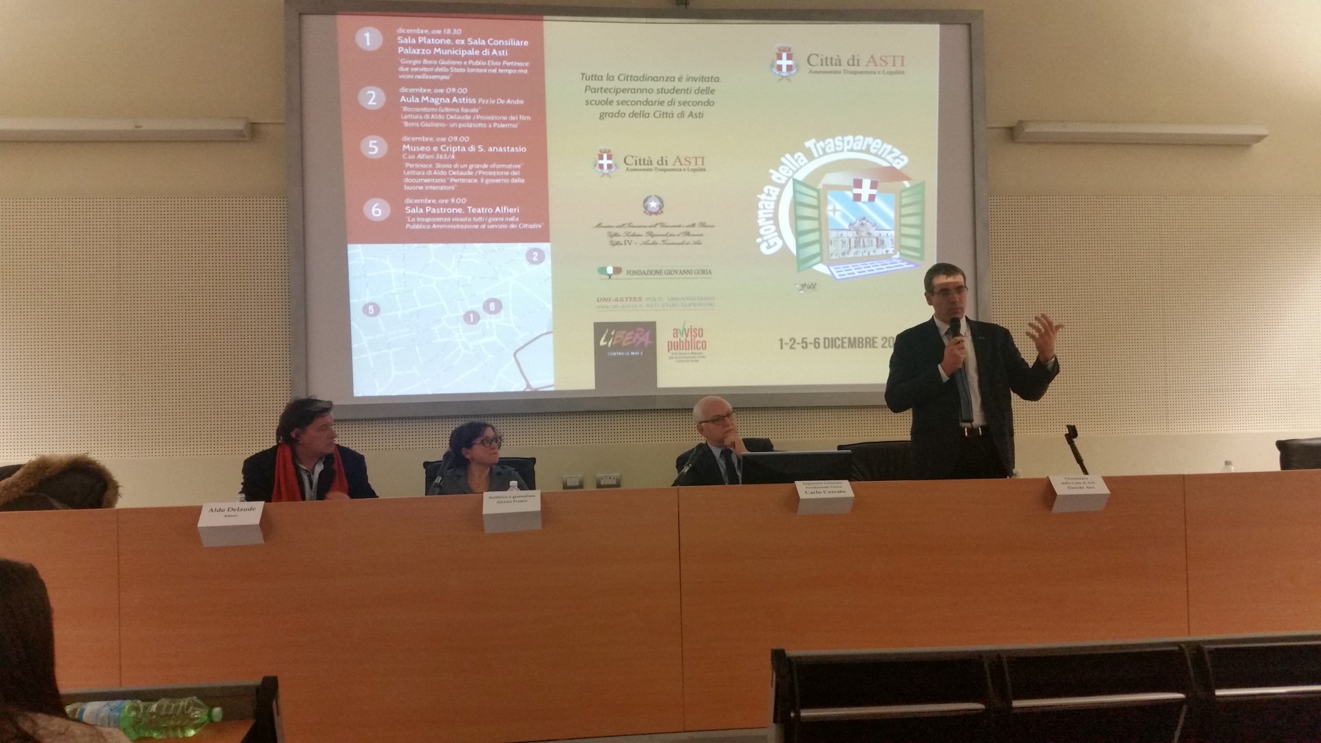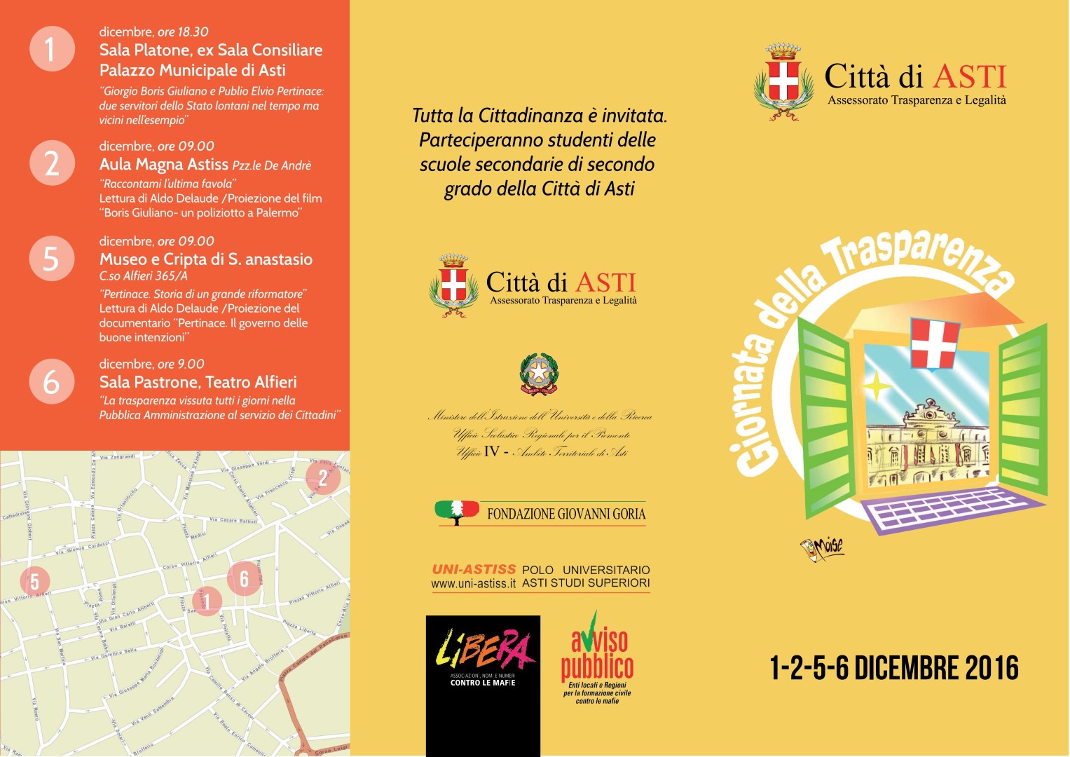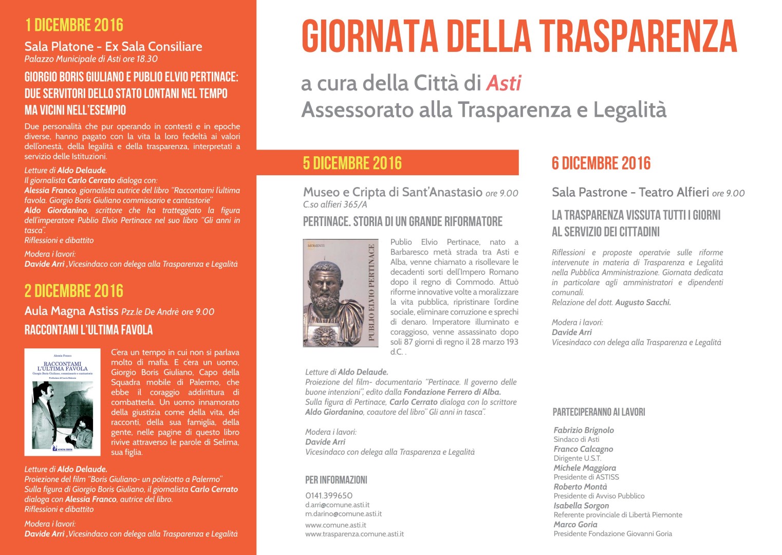 Con la presente Vi ringrazio di cuore per la collaborazione offerta per la migliore organizzazione de “La Giornata della Trasparenza” della Città di Asti, edizione 2016. Grazie al Vostro apporto prezioso siamo riusciti ad offrire un evento di grande spessore, apprezzato dalle Autorità Istituzionali, dai tanti Cittadini e soprattutto dai numerosi nostri Studenti che vi hanno partecipato. Abbiamo così conseguito l’obiettivo di illustrare e rendere accattivante l’esempio di due autentici Servitori dello Stato. A breve provvederò a girarVi la rassegna stampa che stiamo realizzando.