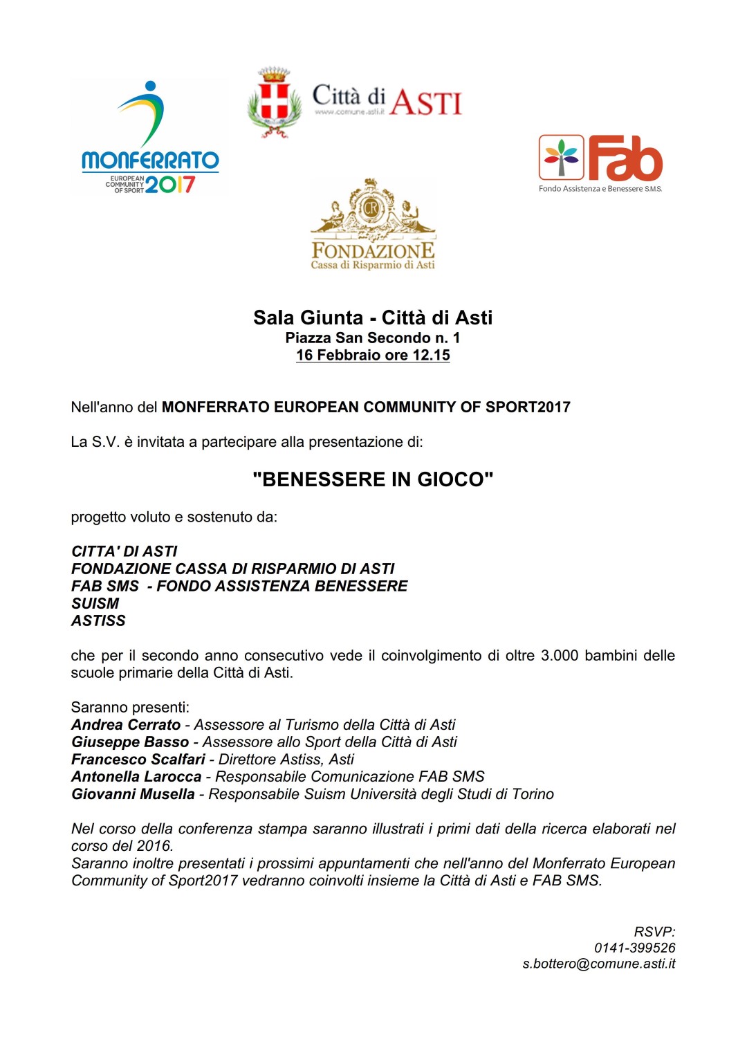 Saranno inoltre presentati i prossimi appuntamenti che nell'anno del Monferrato European Community of Sport2017 vedranno coinvolti insieme la Città di Asti e FAB SMS.