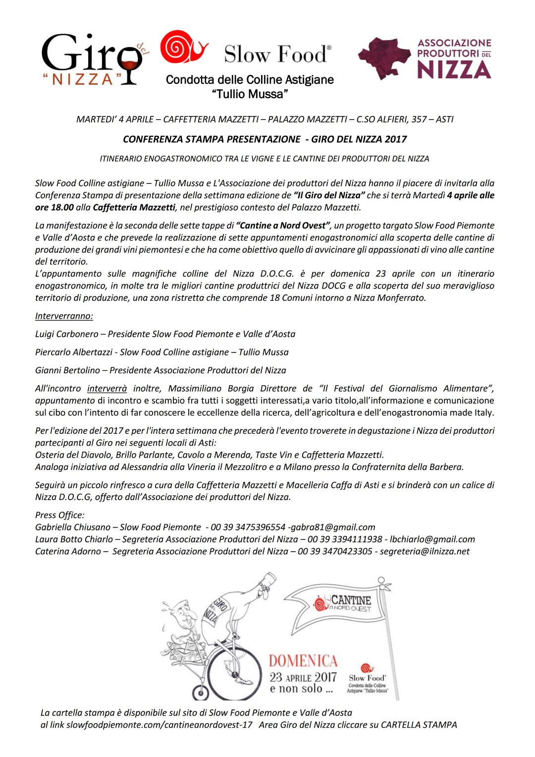 Slow Food Colline astigiane – Tullio Mussa e L'Associazione dei produttori del Nizza hanno il piacere di invitarla alla Conferenza Stampa di presentazione della settimana edizione de “Il Giro del Nizza” che si terrà Martedì 4 aprile alle ore 18.00 alla Caffetteria Mazzetti, nel prestigioso contesto del Palazzo Mazzetti.