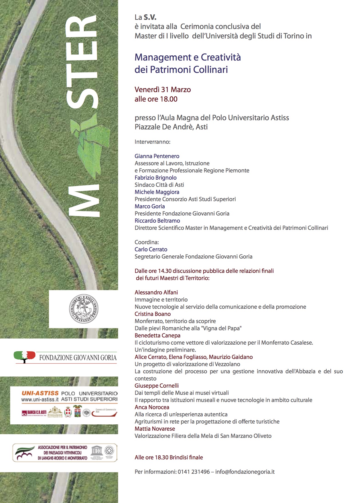 Il Master in Management e creatività dei patrimoni Collinari, nato da una intuizione della Fondazione Giovanni Goria con il Polo Universitario Uni-Astiss è stato realizzato dall’Università degli Studi di Torino, Scuola di Management ed Economia. Il Master è diretto dal professor Riccardo Beltramo.