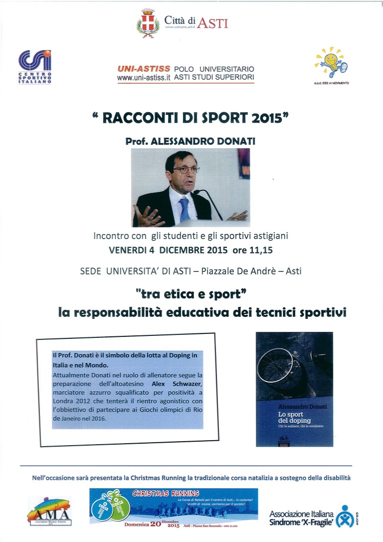 Un dibattito sul tema dell'etica sportiva è in programma venerdì prossimo, 4 dicembre, dalle 11.15, all'università di Asti, piazzale De Andrè. Relatore è il prof. Alessandro Donati, considerato "il simbolo della lotta al doping in Italia e nel mondo".