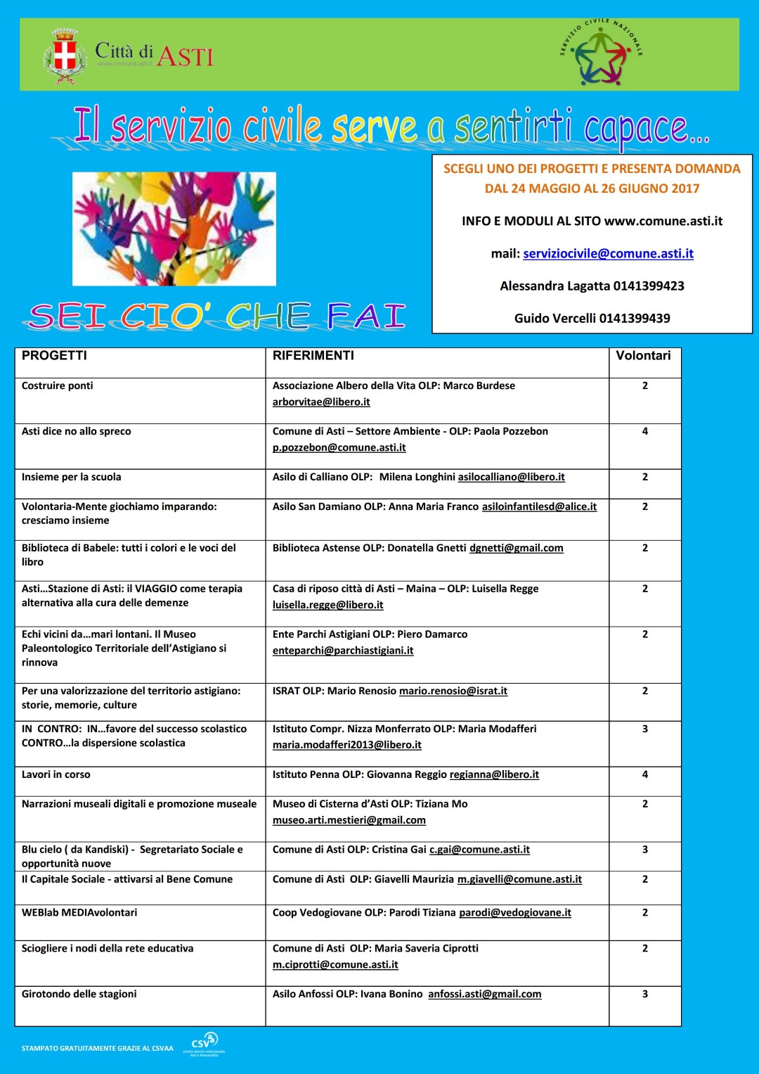 vi giriamo per conoscenza l’elenco dei progetti di servizio civile a cui i ragazzi possono aderire.