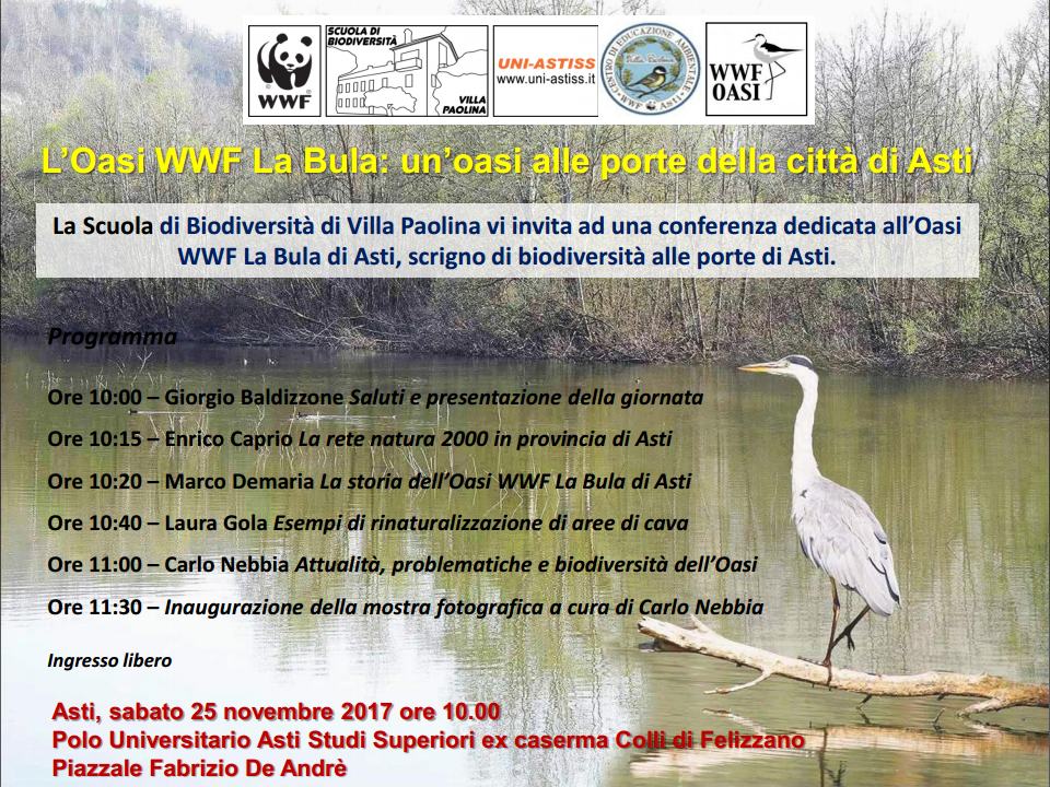 Il 25 novembre, nei locali del Polo Universitario di Asti sarà inaugurata una mostra fotografica con gli scatti più belli e relativi alle specie più interessanti realizzati da Carlo Nebbia. L'inaugurazione sarà preceduta da una conferenza nell'aula magna, nella quale si succederanno i seguenti relatori: